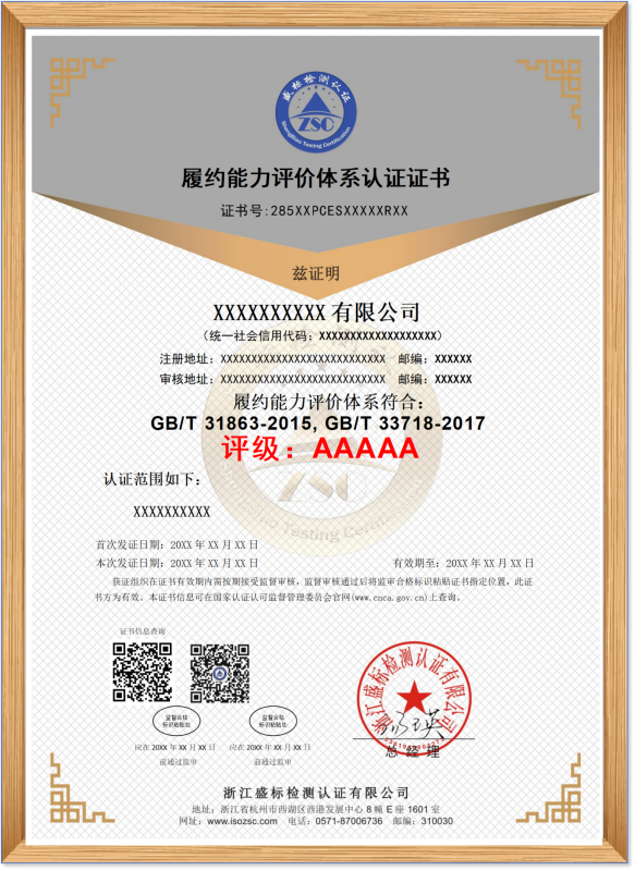 GB/T 31863-2015, GB/T 33718-2017 履約能力評價(jià)體系認證證書(shū)樣本: