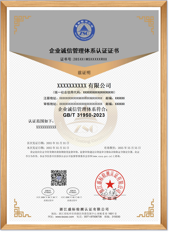 GB/T 31950-2023 企業(yè)誠信管理體系認證證書(shū)樣本: