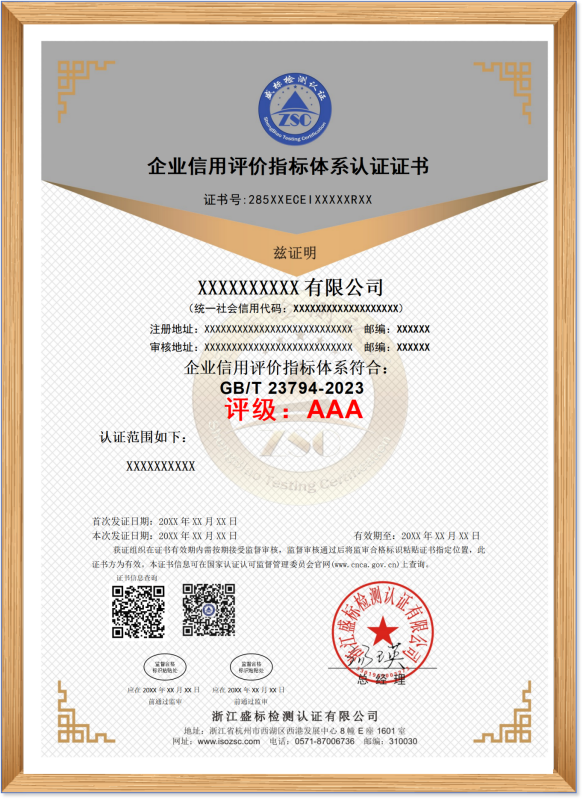 GB/T 23794-2023 企業(yè)信用評價(jià)指標體系認證證書(shū):