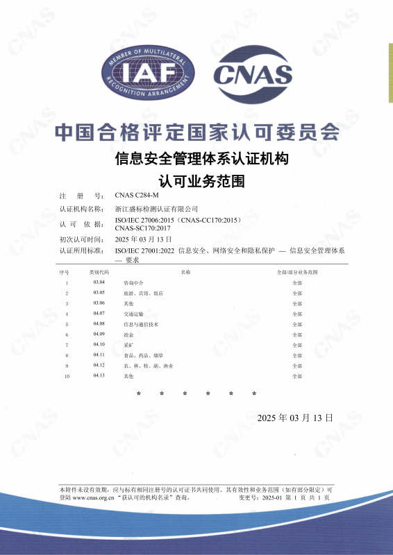 CNAS管理體系認證機構認可證書(shū) - 信息安全管理體系 中文版本 :
