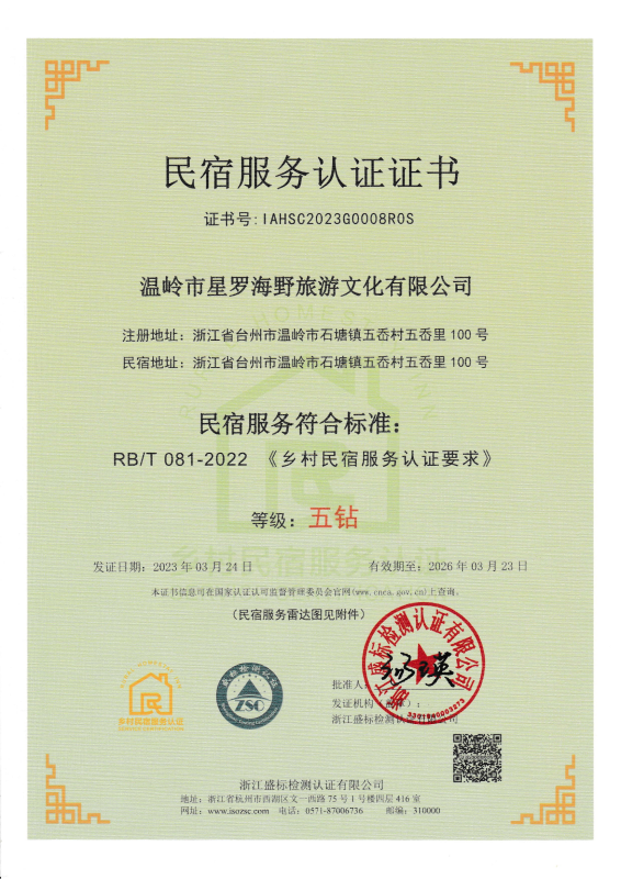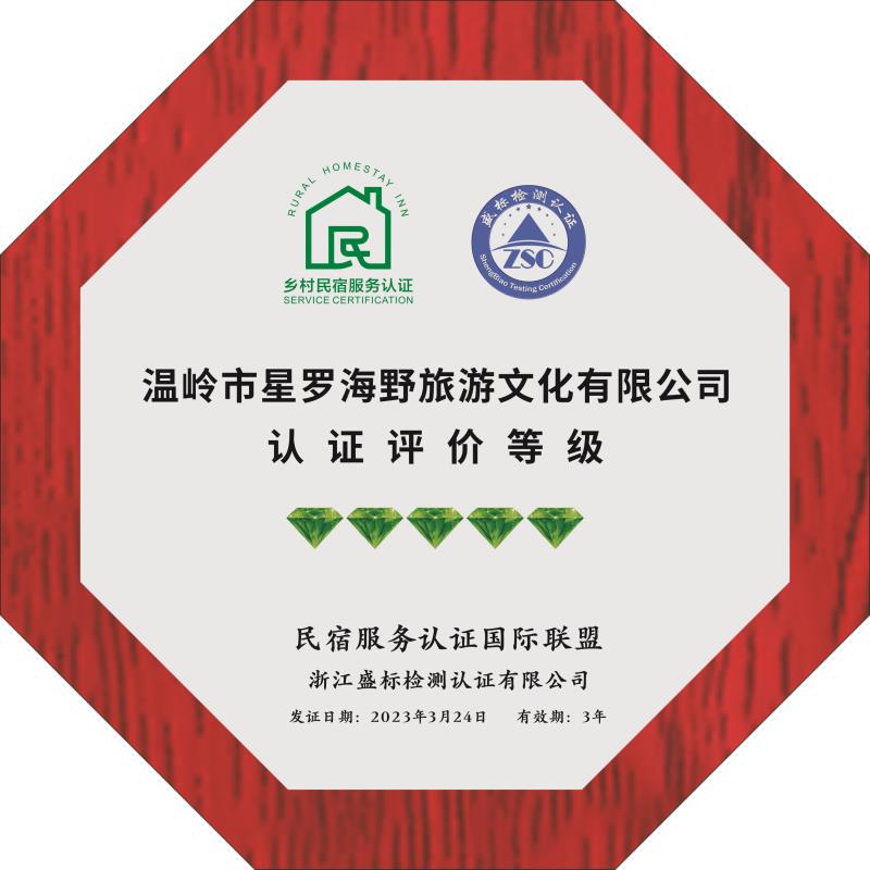 民宿服務(wù)認證為民宿高質(zhì)量發(fā)展傳遞信任、助推鄉村振興!熱烈祝賀溫嶺市星羅海野旅游文化有限公司獲得鄉村民宿服務(wù)認證五鉆級證書(shū)!