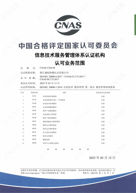 2025年3月27日,浙江盛標檢測認證有限公司再獲喜訊:ISO27001信息安全管理體系和ISO/IEC 20000-1信息技術(shù)服務(wù)管理體系順利通過(guò)中國合格評定國家認可委員會(huì )(CNAS)認可,獲得了雙信息管理體系的認可資格。自從2012年《國務(wù)院關(guān)于大力推進(jìn)信息化發(fā)展和切實(shí)保障信息安全的若干意見(jiàn)》發(fā)布以來(lái),我國大力推進(jìn)信息化發(fā)展,著(zhù)重強調切實(shí)保障信息安全和信息技術(shù)服務(wù)的重要性,全面推進(jìn)信息安全管理體系和信息技術(shù)服務(wù)管理體系的建設,我們盛標認證全體員工亦將為之努力。